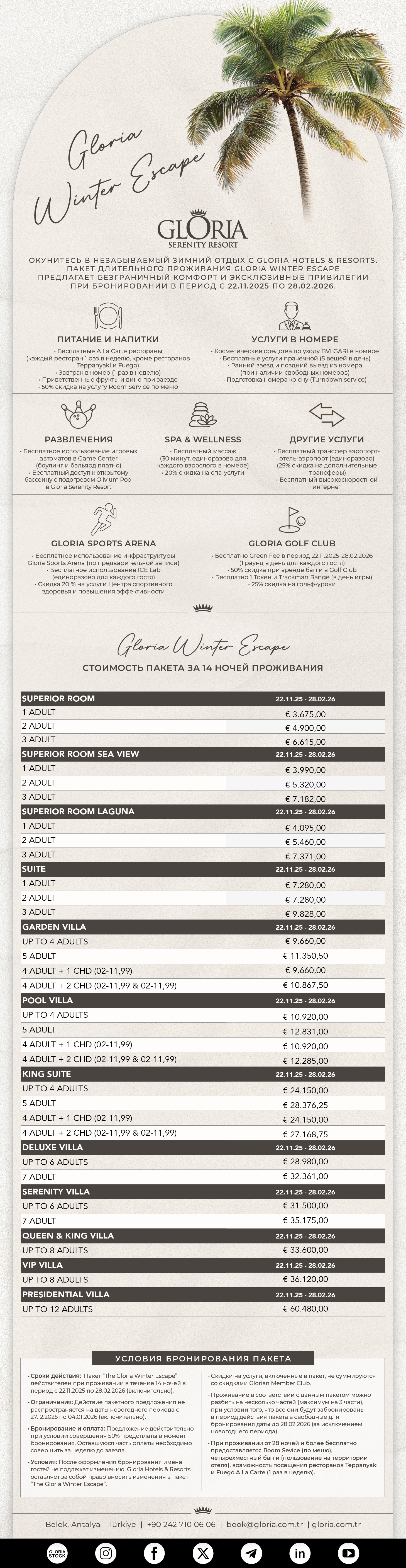 С 22 ноября 2025 года по 28 февраля 2026 года насладитесь роскошью, покоем и привилегиями с эксклюзивным пакетом Winter Escape в Gloria Serenity Resort.