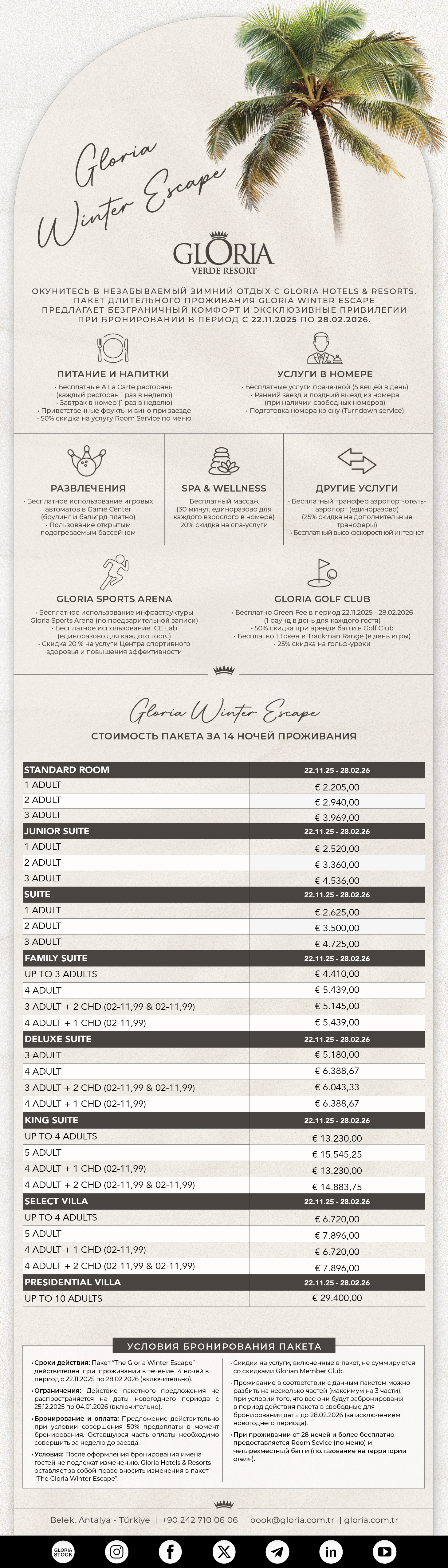 С 22 ноября 2025 года по 28 февраля 2026 года насладитесь роскошью, покоем и привилегиями с эксклюзивным пакетом Winter Escape в Gloria Verde Resort.