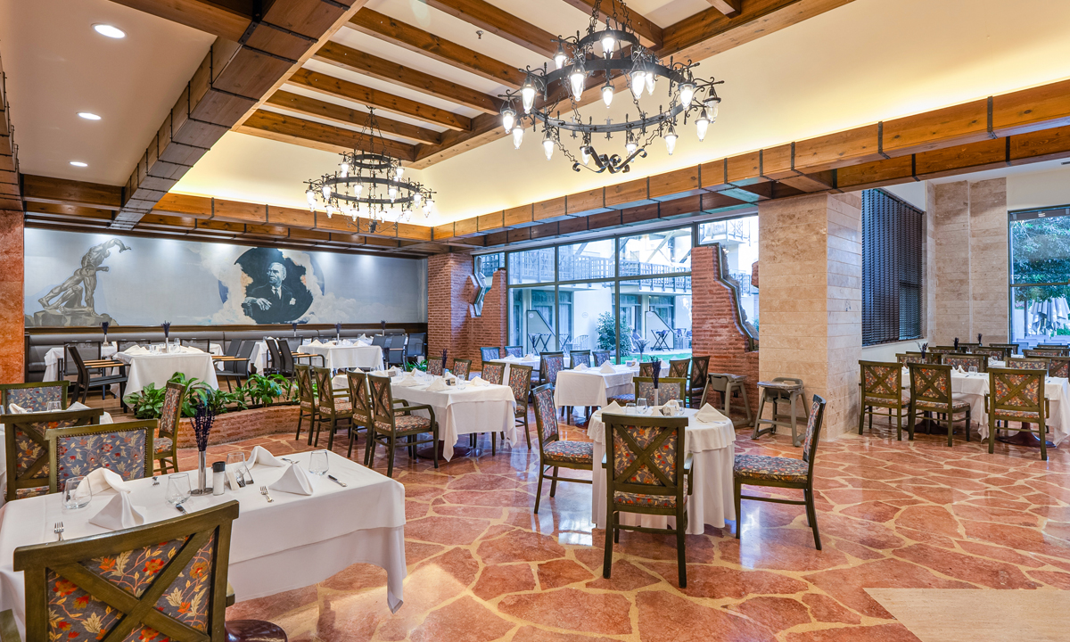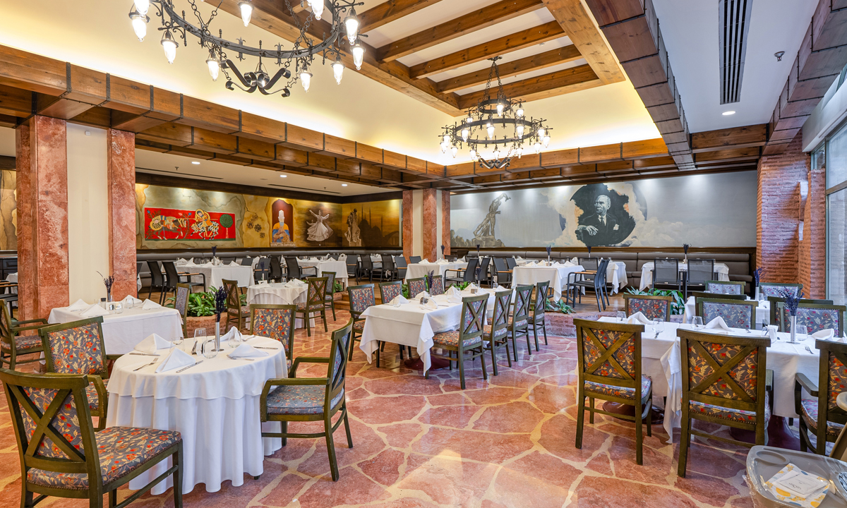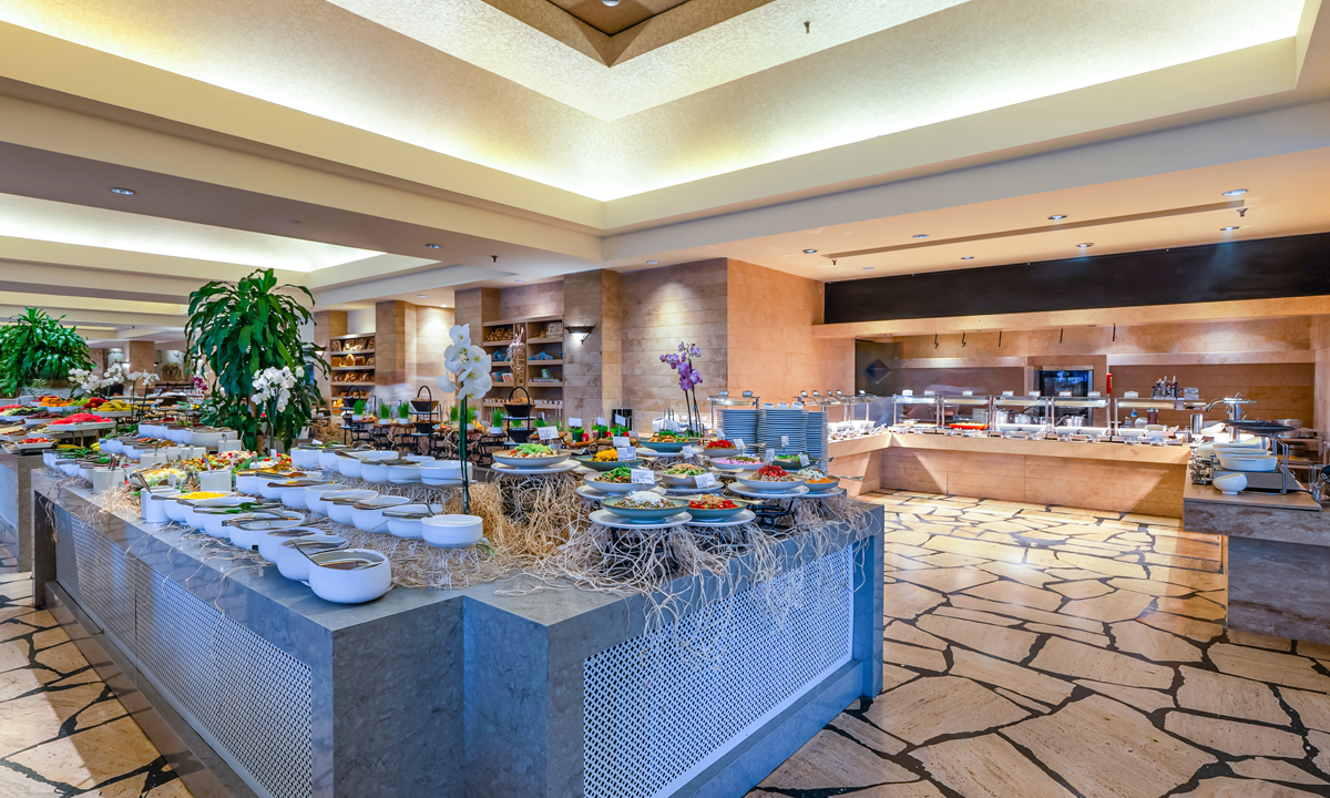 Ana restoranımız, geniş ürün yelpazesi ve seçkin lezzetleriyle sabah öğle ve akşam yemeklerinizi dilediğiniz gibi seçebileceğiniz benzersiz bir açık büfe sunuyor.