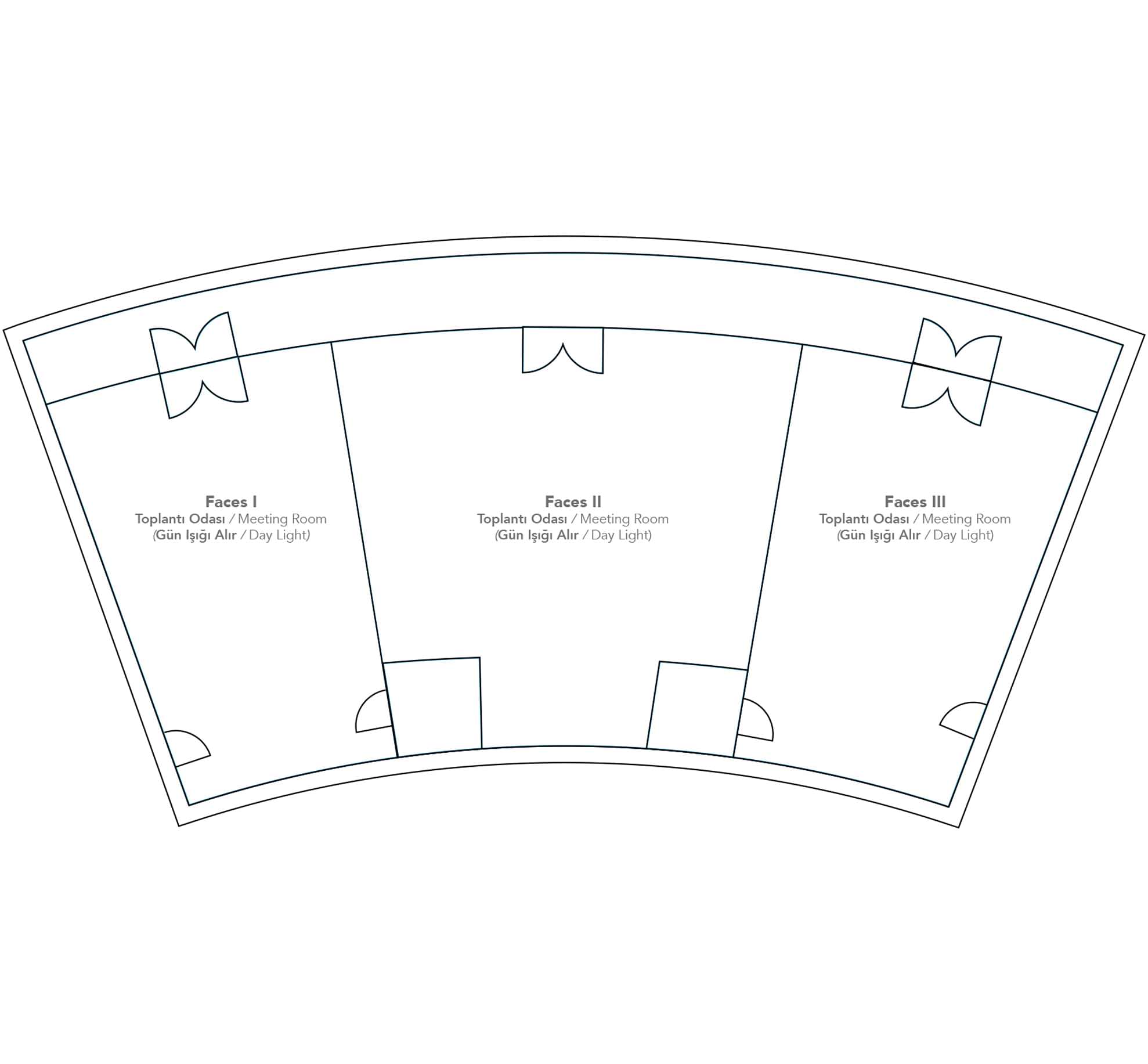 | Faces III (Gün Işığı Alır) | 10,5 m | 6,5 m | 68 m2 | 3,8 m | 30 Kişi | 20 Kişi | 45 Kişi | 24 Kişi |